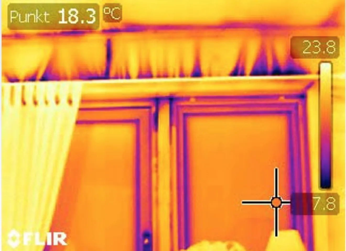 De mørke feltene på bildet viser punkter med stort varmetap. Det ene punktet viser at bindingsverket i tre leder mer varme enn det isolasjonen gjør. Oppe i hjørnet er det en luftlekkasje som skyldes at vindsperren er utett akkurat der.