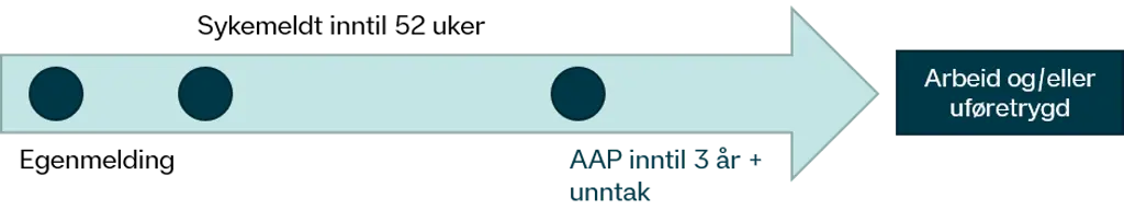 Dersom sykefraværet varer utover 52 uker og din arbeidsevne ikke er tilstrekkelig avklart kan Arbeidsavklaringspenger være aktuelt. Det er strenge krav for å få innvilget Arbeidsavklaringspenger, blant annet et krav om en nedsatt arbeidsevne med minst 50 % til ethvert arbeid og at medisinsk behandling eller arbeidsrettede tiltak har utsikt til bedring av din arbeidsevne.
