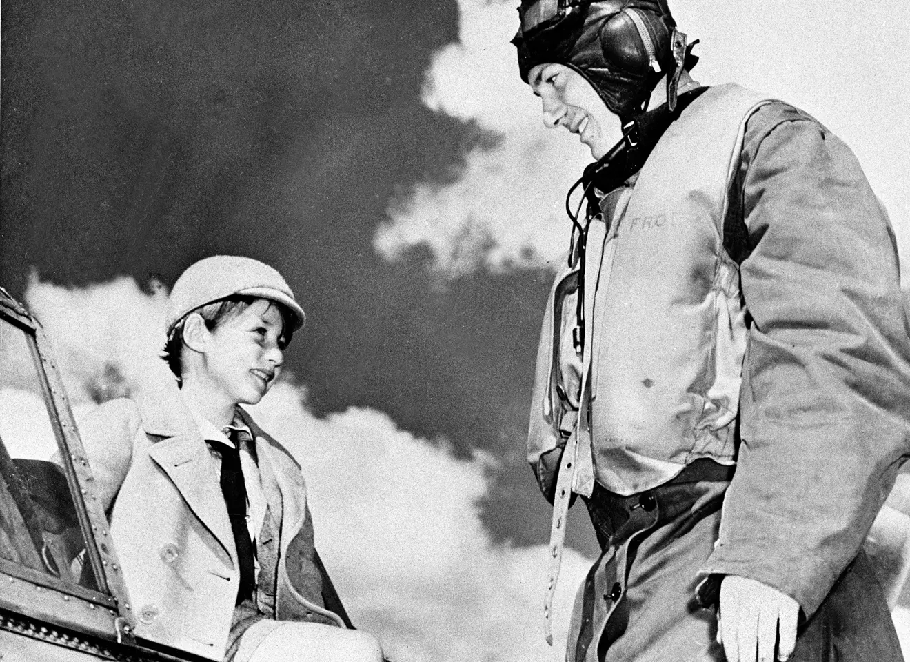 PRINSEN OG FLYGERHELTEN: Prins Harald besøker Little Norway. Her er prinsen sammen med en av flygerne i leiren, Johan Wilhelm Garben fra Oslo. Garben ble utdannet til jagerflyger og omkom under operasjoner over Nijmegen i Nederland 13. mars 1945 (Foto: NTB).