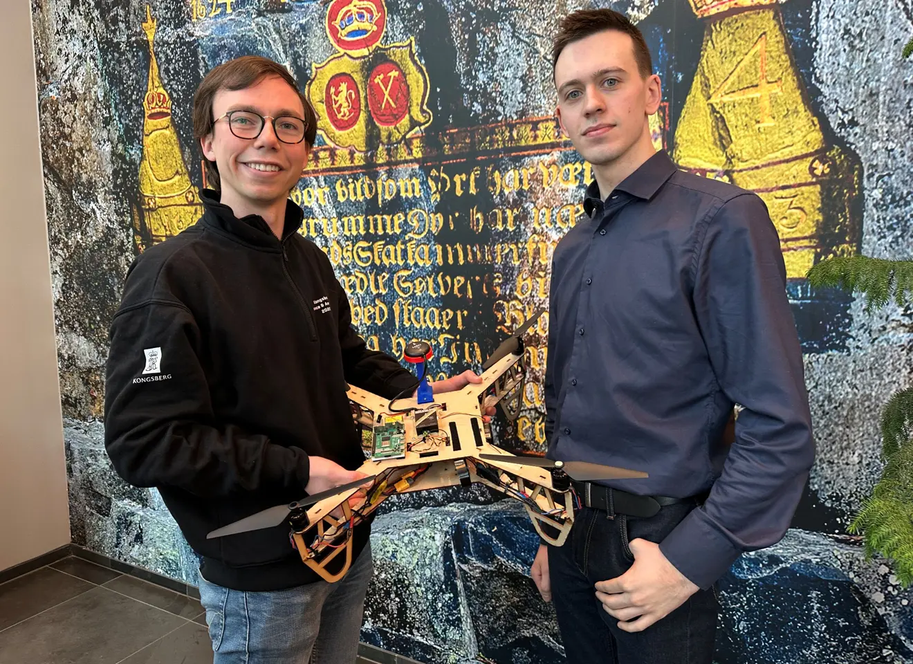 Henrik Mellum og Mathias Enger Storvik bruker informatikk-kunnskapene sine i Kongsberg Defence & Aerospace, deres første faste jobb etter mastergrad, her med en drone fjorårets sommerstudenter har laget.