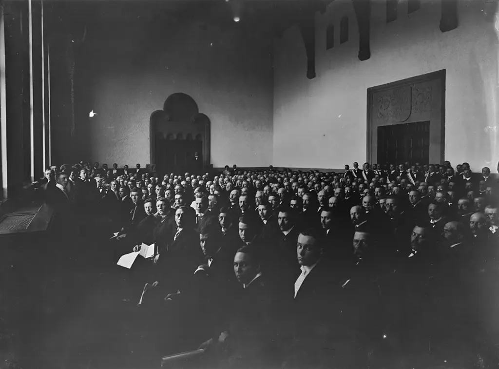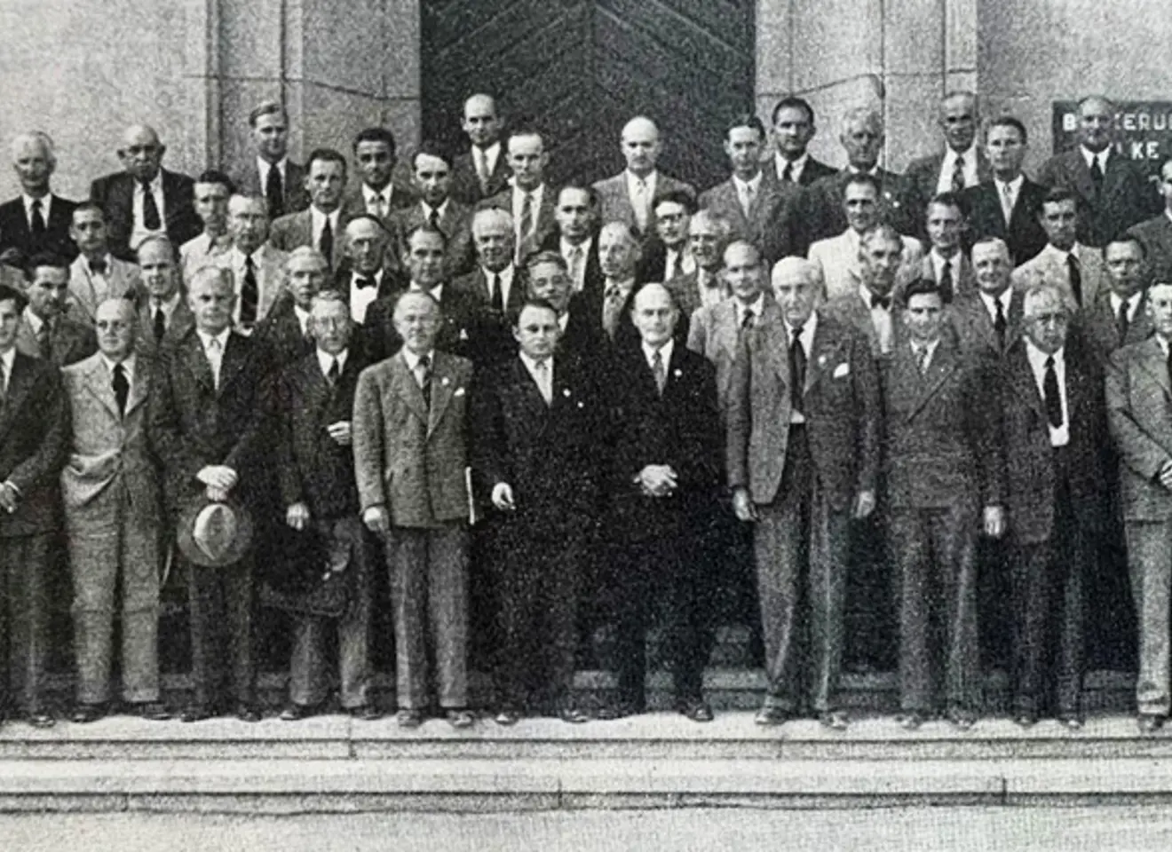 HERRENE I DRAMMEN: De 58 representantene i foreningens øverste organ som her er samlet i Drammen i 1947, vedtar at foreningen også skal være en fagforening (Foto: Tekna).