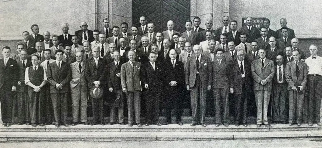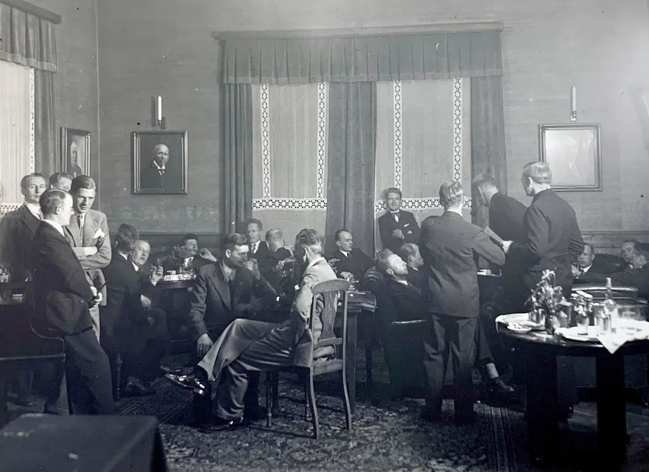 NYE TIDER: Ingeniørenes lønns- og arbeidsforhold blir stadig oftere diskutert i Ingeniørforeningen, her fra et møte i Handelstandsforeningen i N.I.F. Drammen avdeling i 1933 (Foto: Tekna).
