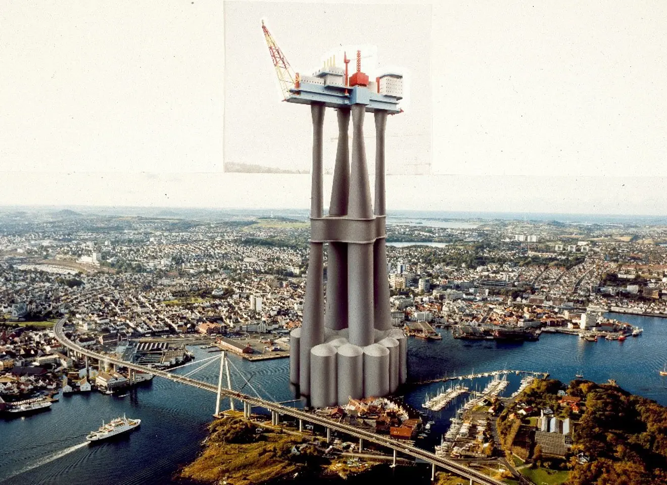 TROLL KAN TEMMES: Plattformen Troll A tegnet inn i Stavanger havn - illustrasjonen viser plattformens størrelse (Foto: Equinor).