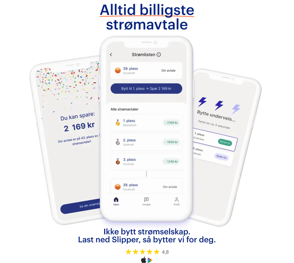 Slipper overvåker alle strømavtaler døgnet rundt og hjelper deg å bytte hver gang det lønner seg. I appen finner du ut av hvilken avtale som passer deg og ditt forbruk best.