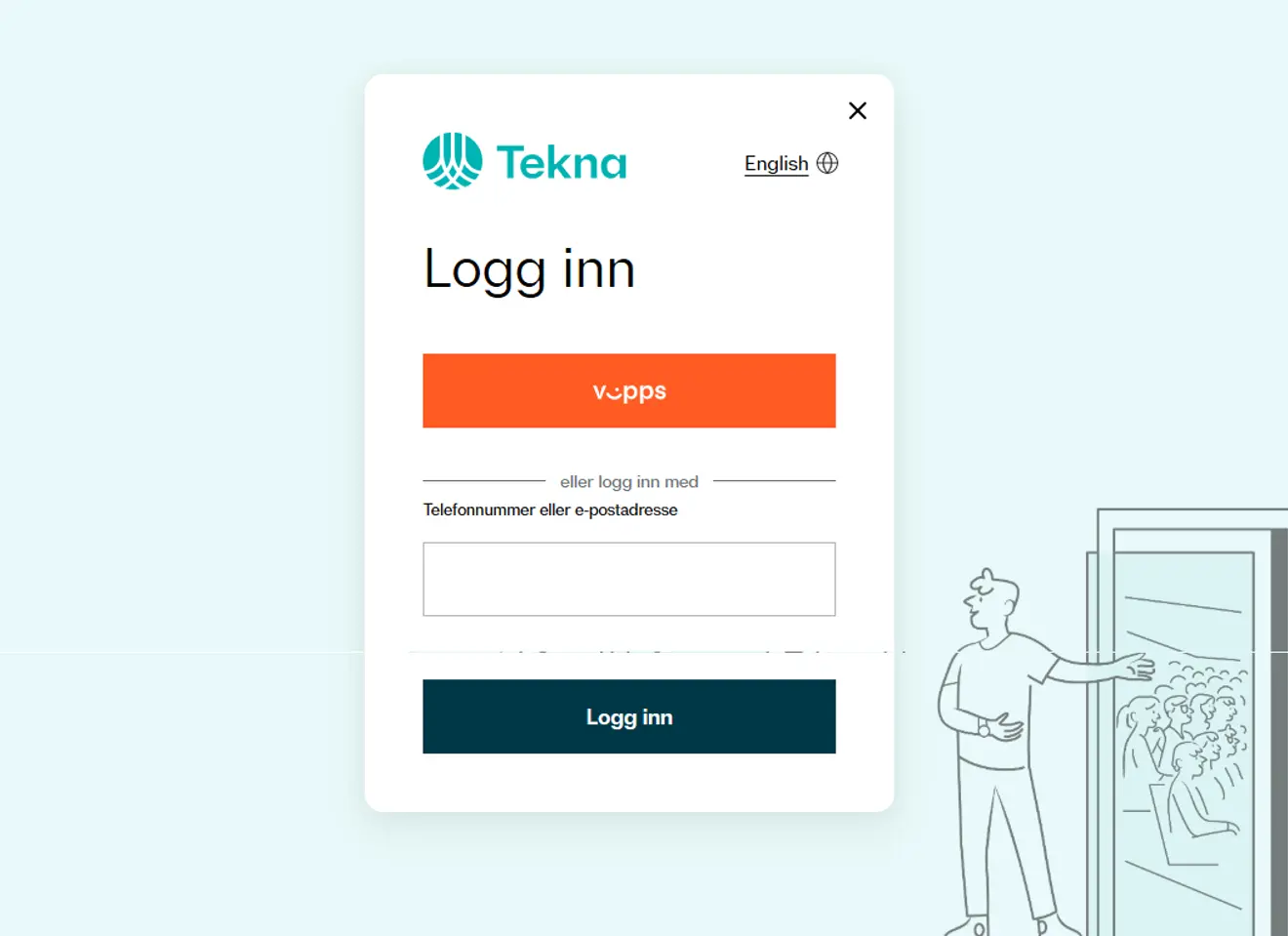 For å logge inn på tekna.no trenger du ikke lenger passord, men kan logge inn med Vipps. Du kan også logge inn med kun telefonnummer eller e-post og engangskode.