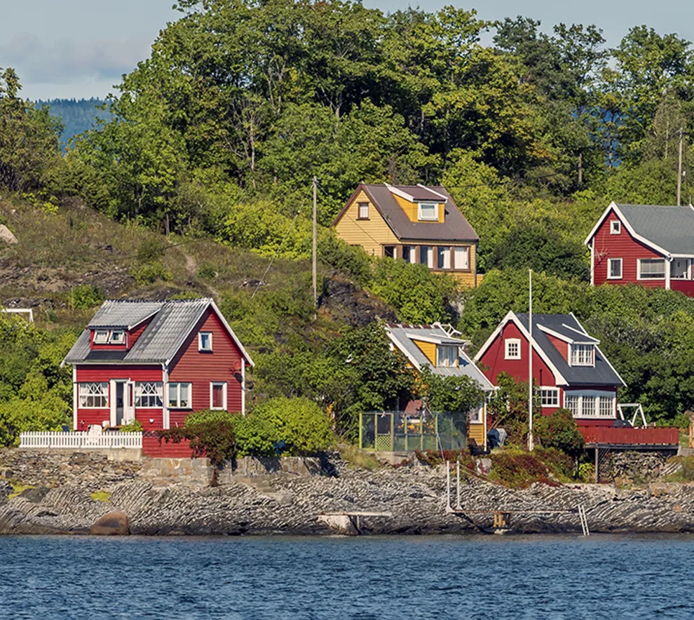 Sommerhus i forskjellige farger på Bleikøya i Oslofjorden
