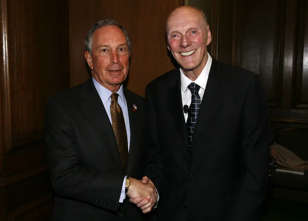 Earl Bakken ved Medtronics hovedkvarter i Fridley, hvor hans formålserklæring er etset inn i glass på flere språk. (Foto av David Brewster/Star Tribune via Getty Images)