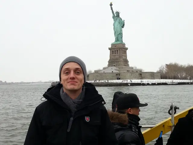 Lederen i lønns- og interesseutvalget i Tekna, Emir Causevic, sier at de Tekna-tillitsvalgte står fritt til å se bort fra frontfagsanslaget i de forestående lokale lønnsforhandlingene. Her er han avbildet foran Frihetsgudinnen i forbindelse med en ferietur til New York.
