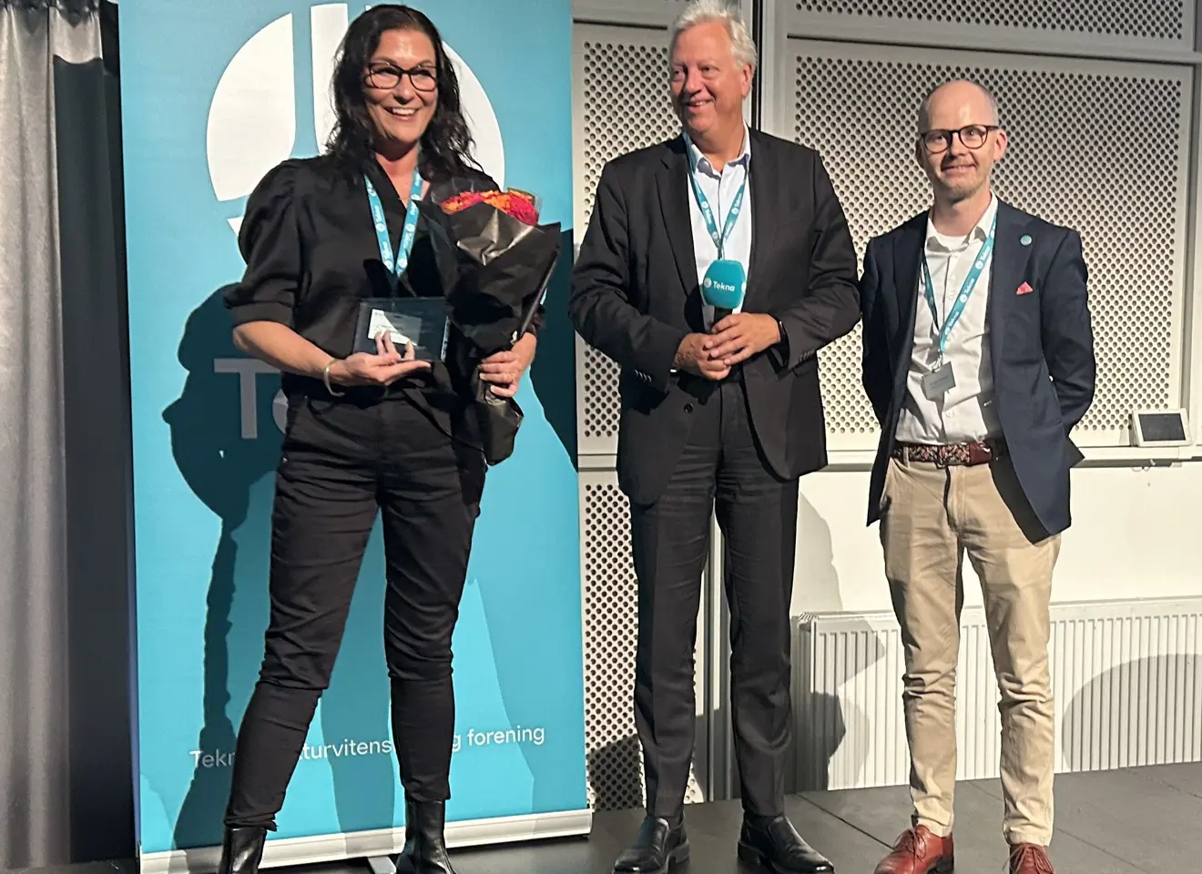 En glad vinner av Helsegründerprisen Hege Hansen, sammen med representanter for arrangørene av konferansen, Arild Kristensen fra Norway Health Tech og visepresident i Tekna, Krister Nyløkken.