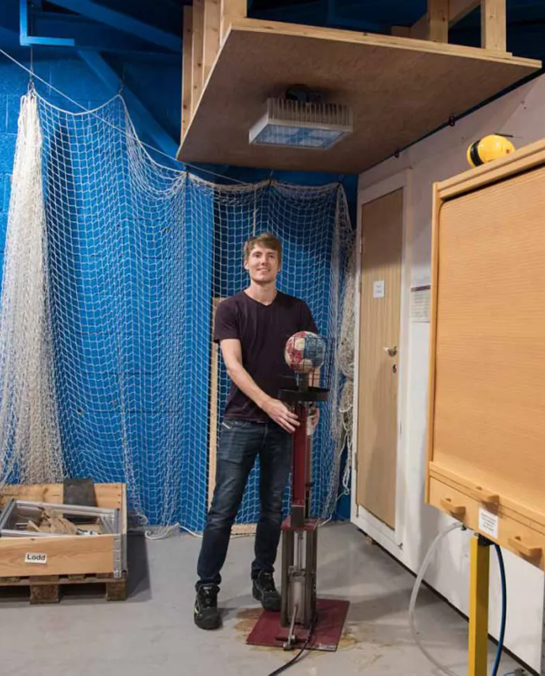Armaturer i idrettshaller må tåle harde støt. – Da bruker vi denne ballkanonen for å test, viser Martin Iversen og fyrer av et skudd mot et takarmatur i hastighet på cirka 16 m/s.