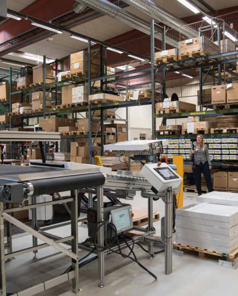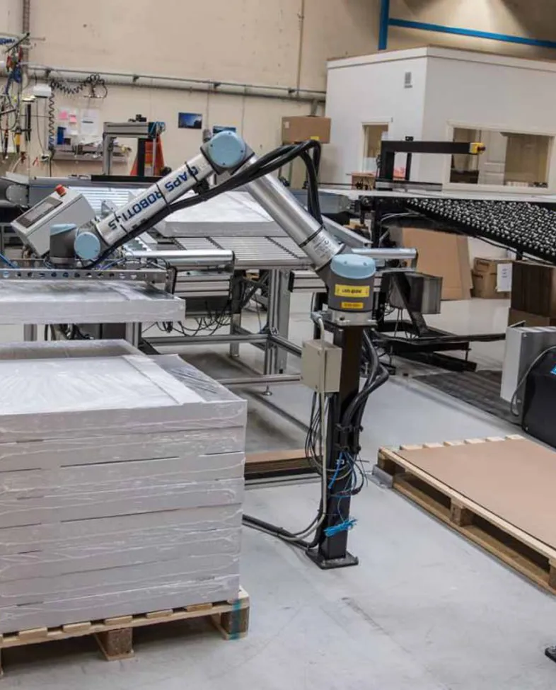 Vi får gå en runde i de romslige fabrikklokalene. Her er mye etter hvert automatisert. Roboter kutter tynnplatene som kommer inn i ruller. Det stanses, bøyes, knekkes og formes. Det fuges og brettes, og det pakkes. – Flere nye industriroboter er kommet på plass de siste årene, sier Horn. Noen er store og såpass voldsomme i bevegelsene at de er plassert bak gitter. Noen mindre «collaborate»-roboter, som for eksempel utfører pakking, trenger ikke sikkerhetssone.